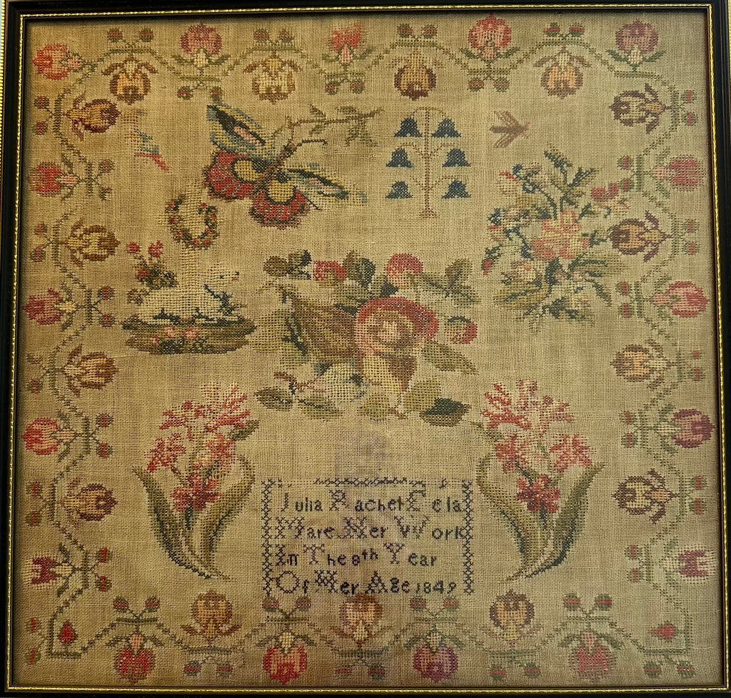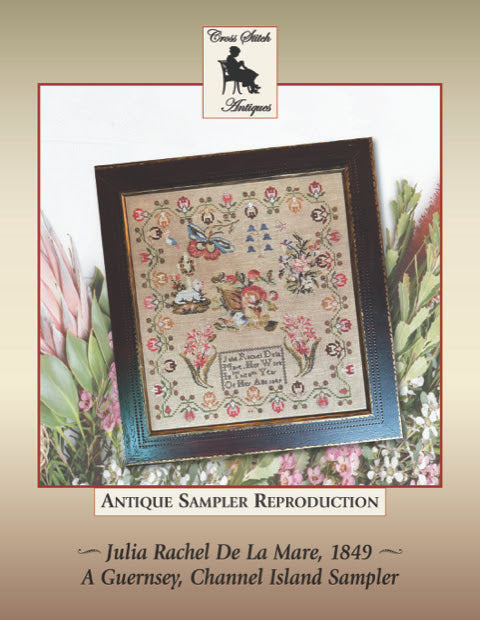 The Antique: 17 inches wide x 16.5 inches high on 26 count linen with wool threads