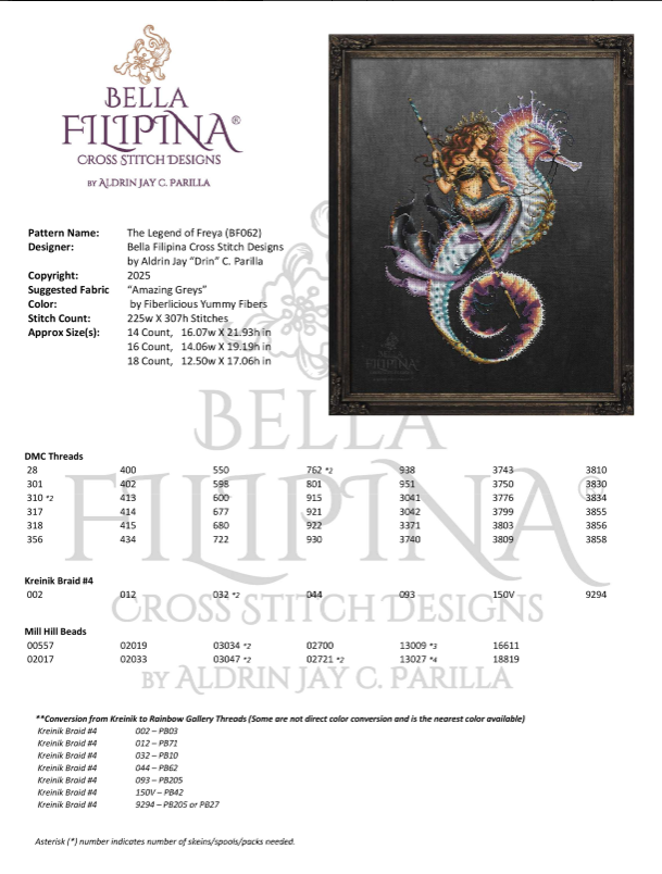 Stitch Count: 225w x 307h. Finished size on 14 ct is 16.07" x 21.93".