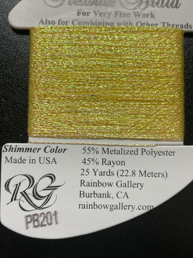 65% Rayon, 35% Metalized Polyester. 25 Yard Cards. Hand Washable, Test First. Made in Japan & USA. A 3-ply braided metallic, Treasure Braid Petite is for very fine work or to combine with other threads. Light coverage for 18 count but works great for Cross Stitch too.