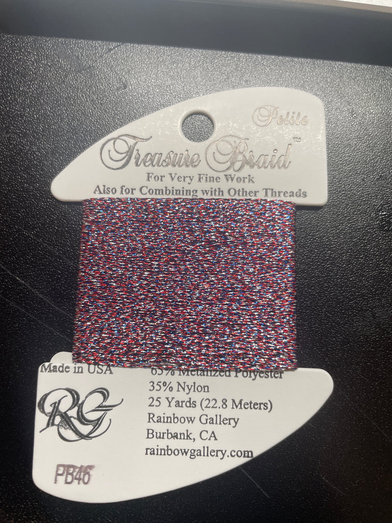65% Rayon, 35% Metalized Polyester. 25 Yard Cards. Hand Washable, Test First. Made in Japan & USA. A 3-ply braided metallic, Treasure Braid Petite is for very fine work or to combine with other threads. Light coverage for 18 count but works great for Cross Stitch too.