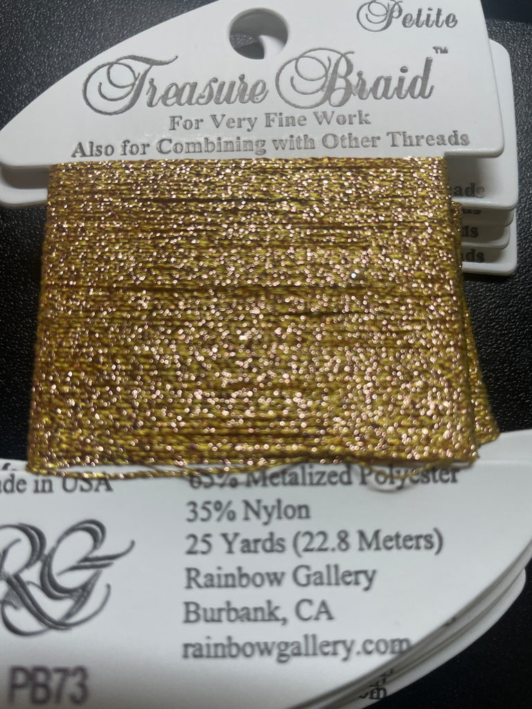 65% Rayon, 35% Metalized Polyester. 25 Yard Cards. Hand Washable, Test First. Made in Japan & USA. A 3-ply braided metallic, Treasure Braid Petite is for very fine work or to combine with other threads. Light coverage for 18 count but works great for Cross Stitch too.