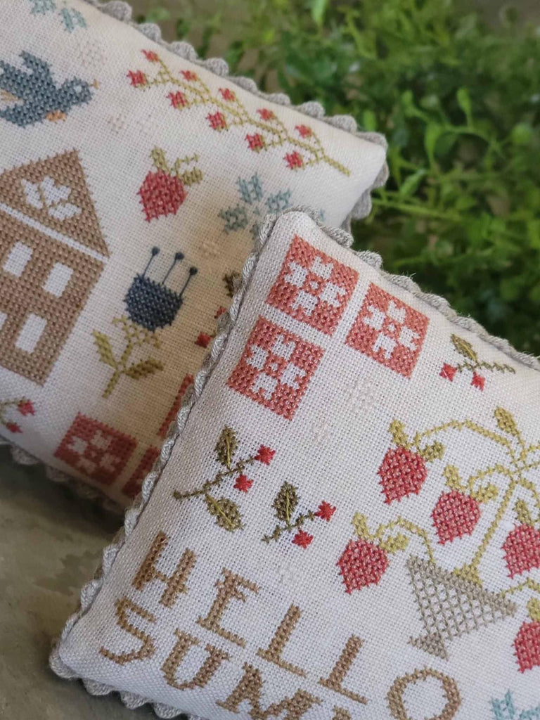 Flosses: DMC - 22, 356, 436, 3032. WDW - 1101 Light Khaki, 1240 Dirt Road, 2197 Oscar, 3960 Teal Frost. GAST - 7018 Woodrose. CC - Blue Corn, Avocado, Deep Fennel, Ye Old Gold.